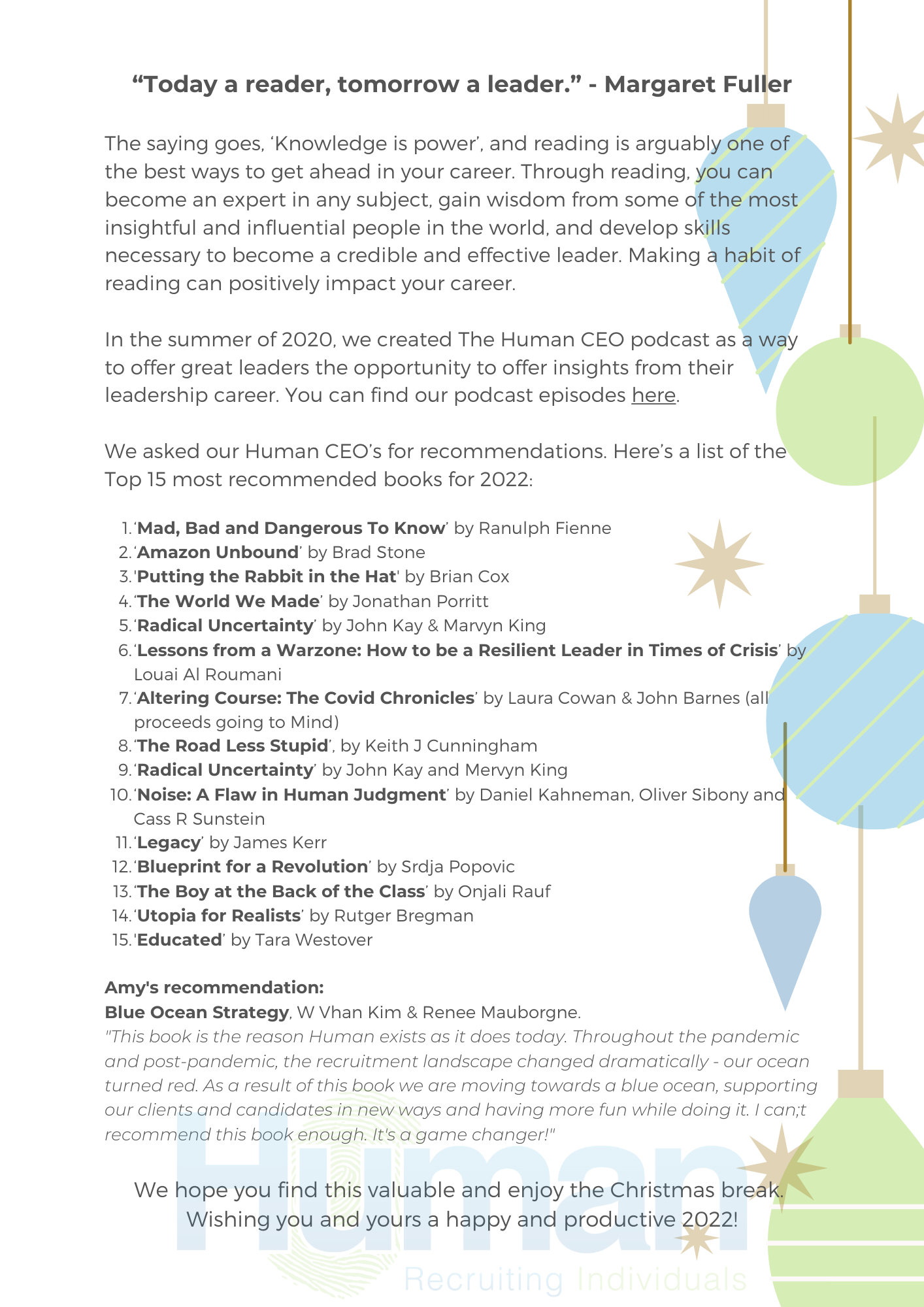 With the end of what has been another unusual year fast approaching, we hope you have some downtime scheduled. We thought it might be interesting to ask all of our Human CEOs for their book recommendations to get you started on your Christmas reading.