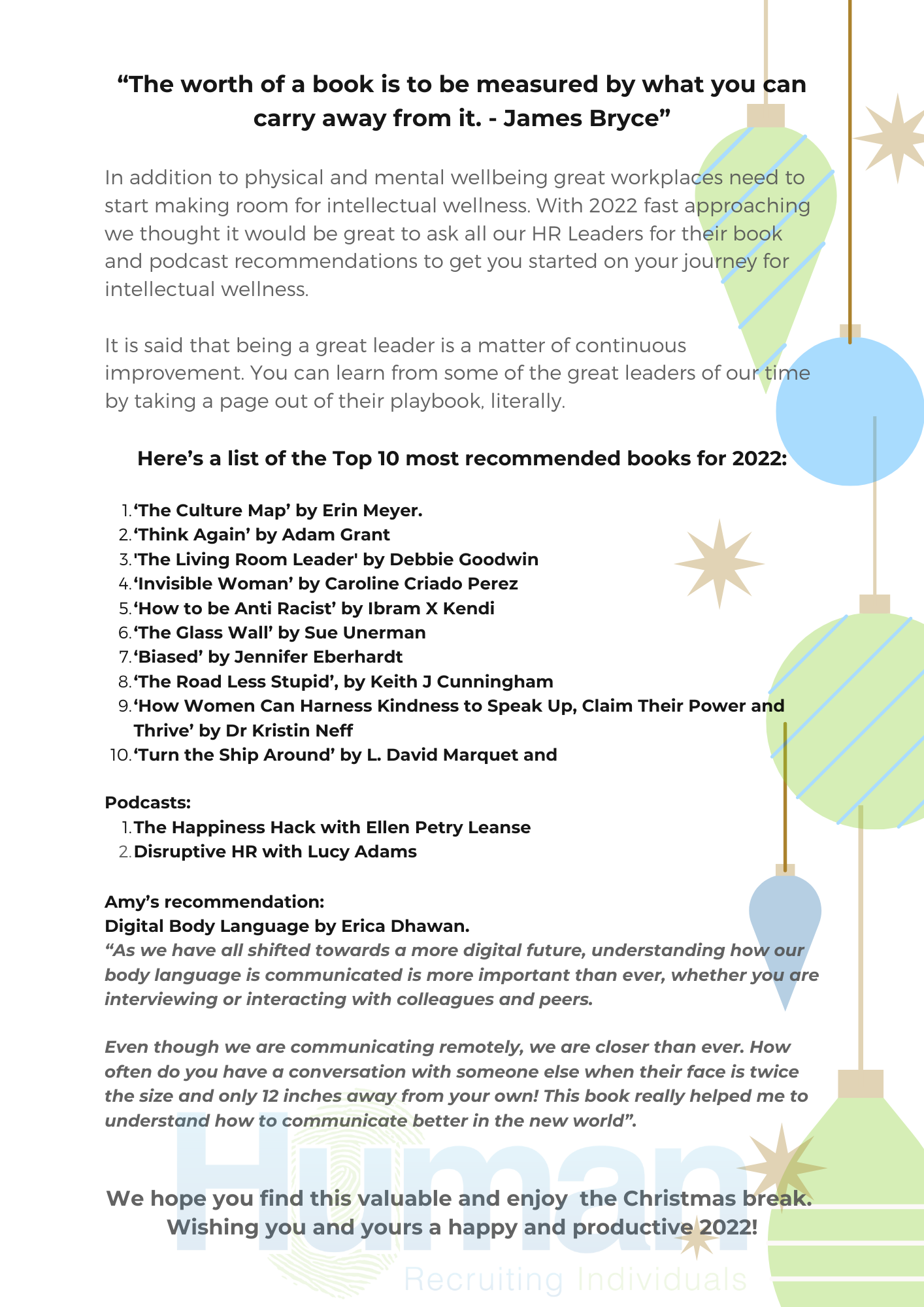 In addition to physical and mental wellbeing great workplaces need to start making room for intellectual wellness. With 2022 fast approaching we thought it would be great to ask all our HR Leaders for their book and podcast recommendations to get you started on your journey for intellectual wellness.